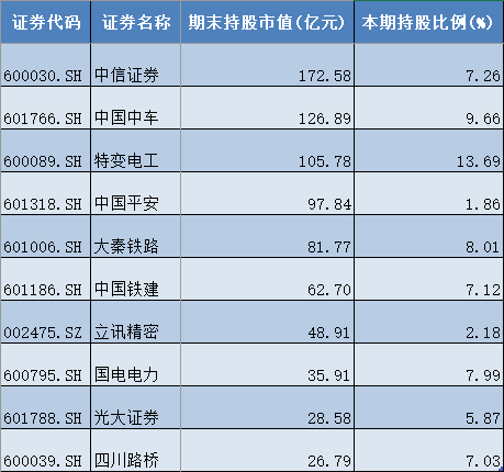 中国平安、大秦铁路(601186)、中国铁建(601186)持股市值均超过50亿元,分别为97.84亿元、81.77亿元、62.70亿元。