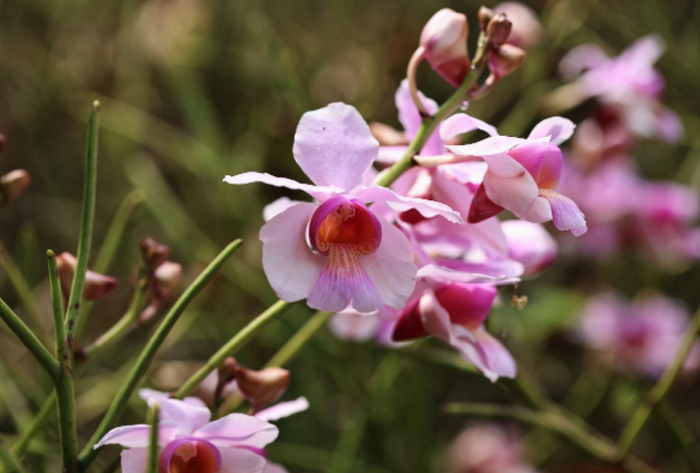 据蒋宏介绍,凤蝶兰主要生长在海拔600-1200米的林缘或疏林中树干上。它的突出特征是:叶肉质、圆柱形,总状花序比叶长,粉红花瓣近圆形,中裂片两深裂形似凤尾。婀娜花姿似凤蝶,风来难隐谷中香……花朵娇嫩,十分漂亮。