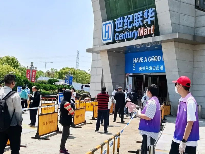 “打开健康码,里面测温。”5月2日中午12点,记者来到百联南桥购物中心,看到世纪联华奉贤店外,前来购物的市民间隔两米,按引导线有序地排成“之”字形,有序入场。