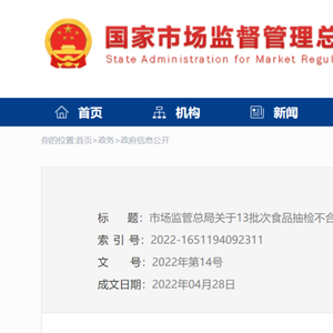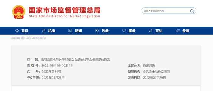 近日,市场监管总局官方网站公布13批次食品抽检不合格情况。在近期抽取的27大类食品658批次样品中,检出9大类食品13批次样品不合格,其中涉及淘宝、拼多多等网店和线下商店出售的部分炒货食品及坚果制品、饼干、调味品和婴幼儿配方食品等。