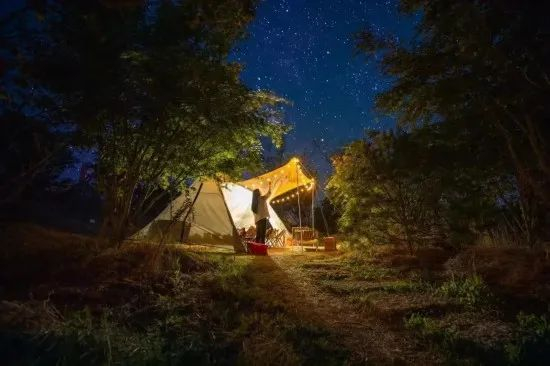 夜幕降临时,营地星星点点的灯串便和星星一起亮起来,文艺浪漫的气息环绕整座山野。置身山野,看远山隐于夜色,高低起伏错落有致;听丛林婆娑作响,风吹林声心旷神怡。