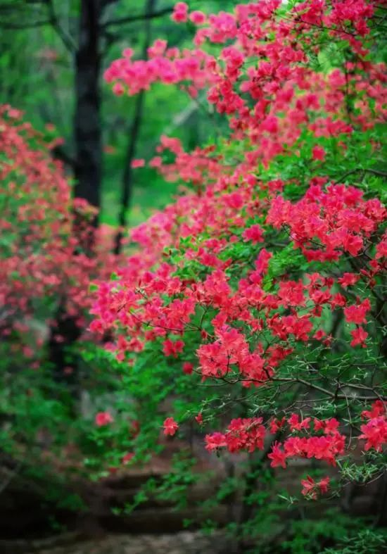 在五莲山风景区,热热闹闹的杜鹃花漫山遍野盛开起来,荡起层层红色波浪,似霞似棉,一眼望去净是撩人的春意,当真应了那句诗“万壑树参天,千山响杜鹃”。