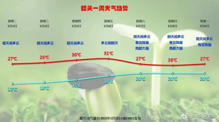俗语说:“未食五月粽,寒衣不入栊。”还是有点道理的,今年“五一”,冷空气再一次“动真格”,截至昨日,广东多地迎来最凉快的“五一”,全省平均最低气温只有14.7℃。其中,包括韶关的曲江(13.0℃)、新丰(12.7℃)、始兴(13.0℃)、翁源(12.9℃)等65个县(市、区)打破历史同期纪录。假期后半段,我市云量减少,阳光强势霸屏,预计明后两天都会维持晴好的天气,最高气温开启反弹模式,会逐日上升,未来两天的最高气温将升到27℃-28℃。但最低气温仍挣扎在1字头附近,只有11℃-13℃,凉意较为明显,昼夜温差大。外出游玩的朋友注意防晒补水,另外需要注意的是早晚气温仍然较低,请适时添衣。