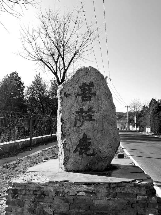村东头的路边竖立着一块粗糙的褐色石头,上面镌刻着“菩萨鹿”三个红色大字。这既是村名,也是一个流传千年的古老传说。从这块石头往西南走,几步开外是一座关帝庙,只有一间仿古建筑,门锁着。从门上的菱形空隙往里看,可见正在读书的关公塑像,书本旁边竖立着他的青龙偃月刀。关帝庙旁边是一株古槐,树干上裹着黄色的织物。古槐与关帝庙之间有石桌石凳,若在盛夏,这里也许是村民们纳凉的地方。在海阔天空的闲聊中,他们会说到菩萨和那只鹿吗?我想会的,因为诗情画意的村名就隐藏在那个传说里。