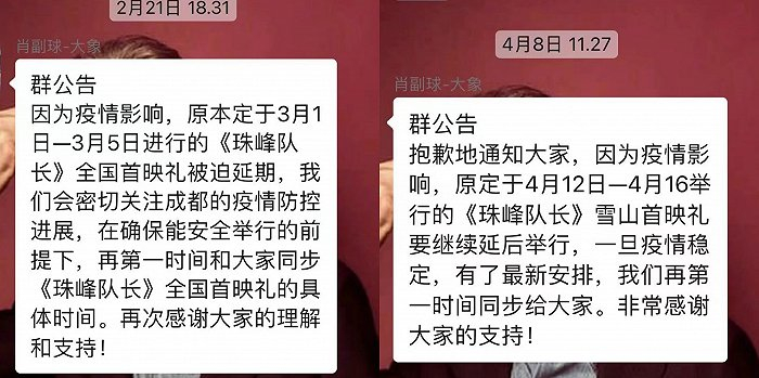 随后,肖副球在群聊中通知原定于3月1日至3月5日举办的首映礼被迫延期。疫情让“雪山首映礼”和《珠峰队长》3月18日公映的计划一起搁浅,也让大象点映不得不重新选择电影的上映时间。“我们还想4月底可能是一个可以定档的时间。如果是4月底上映的话,往前推,首映礼就要在清明节假期附近。但是在清明附近的话,因为有个小长假,电影院线的负责人可能要留在影院去指导他们的日常工作,所以去不了。”