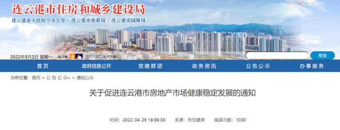 4月29日,连云港市房地产市场调控发展领导小组办公室发布《关于促进连云港市房地产市场健康稳定发展的通知》,自2022年5月1日起,从六方面调整房地产市场调控相关措施。