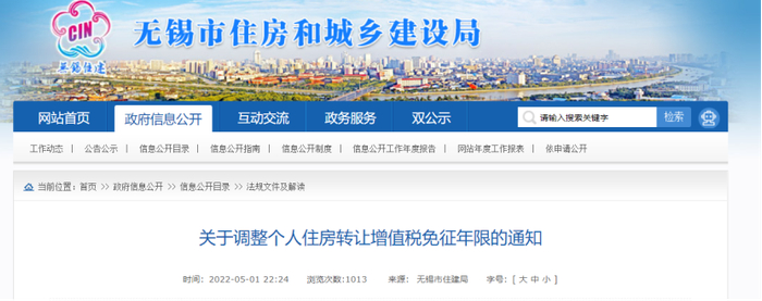 除了梅州和连云港出台降首付等稳地产政策,5月1日,无锡市住建局、国税总局无锡市税务局联合发布《关于调整个人住房转让增值税免征年限的通知》,明确将个人住房转让增值税免征年限由5年调整为2年。