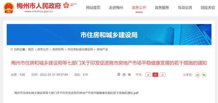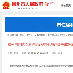 5月1日,梅州市住建局等七部门联合印发《促进我市房地产市场平稳健康发展的若干措施》,从完善住房领域金融服务、调整公积金贷款比例、加强房地产销售市场监管、强化土地供应和房地产市场联动、优化房地产项目立项审批手续、加强城市基础配套设施建设等六方面提出具体措施。