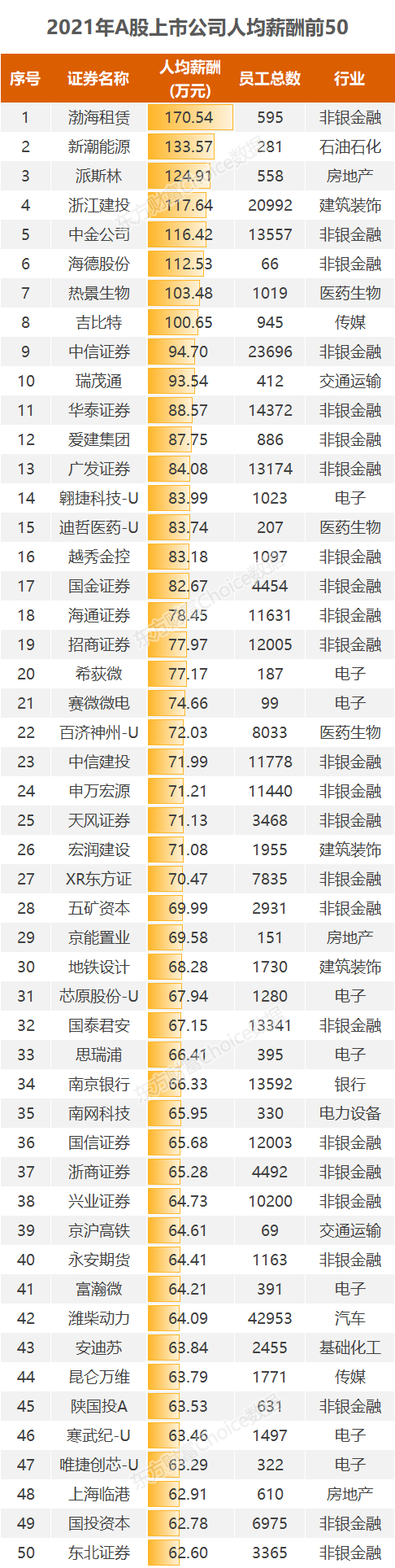 具体看,渤海租赁去年人均薪酬170.54万元,位列A股第一。同时,人均薪酬超百万的还有新潮能源、中金公司、热景生物、吉比特等公司。