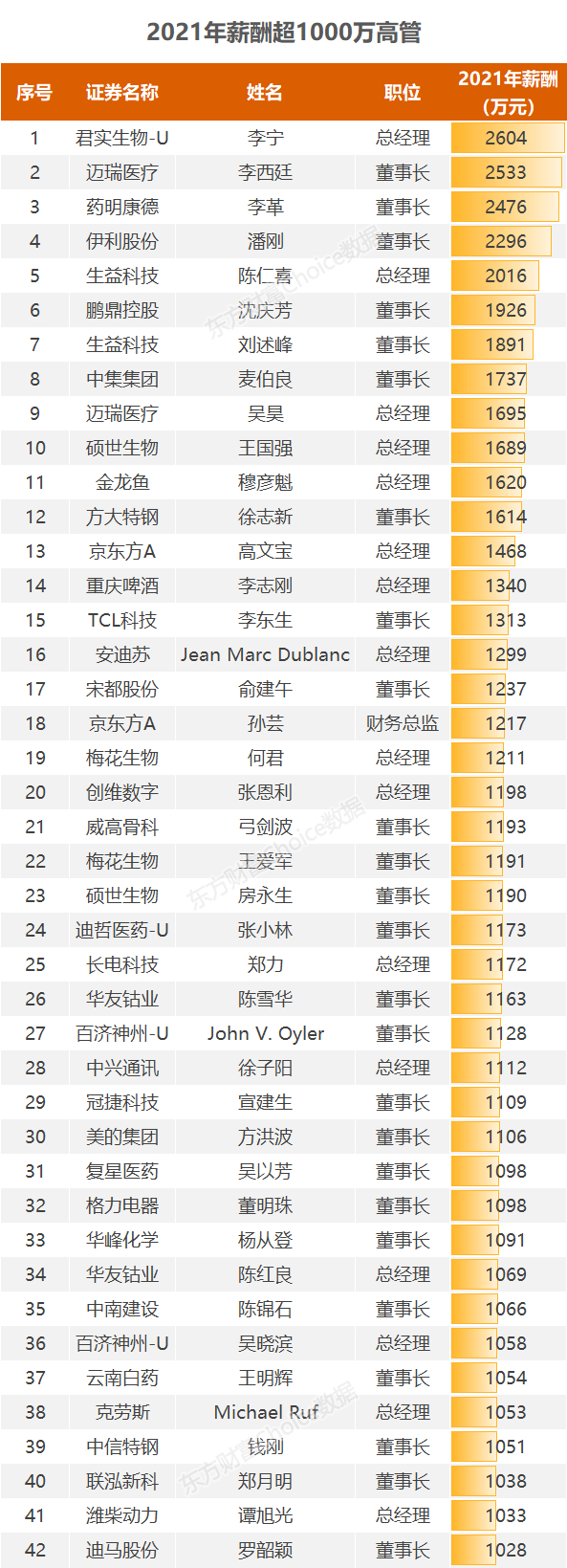 从高管年度薪酬来看,2021年有42位老总年度薪酬超过1000万元,君实生物-U总经理李宁以2604万元的年薪位列高管薪酬榜首。其外迈瑞医疗董事长李西廷、药明康德董事长李革、伊利股份董事长潘刚、生益科技总经理陈仁喜的年度薪酬均超2000万元。硕世生物、生益科技、梅花生物、迈瑞医疗、京东方A、华友钴业等公司有多位老总上榜。