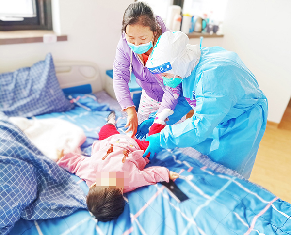 孙沛鋆(右)为小朋友抚触检查