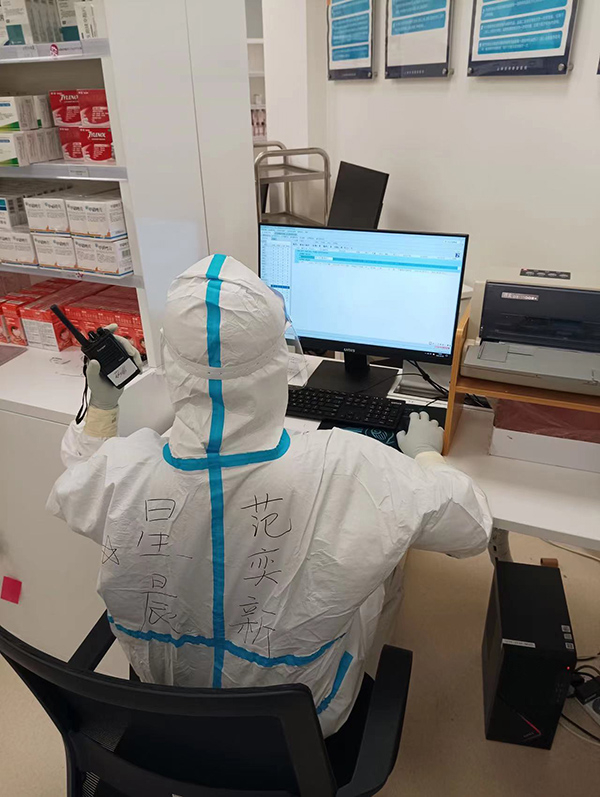 4月18日,览海定点医院收治病人的第二天,药剂师范弈新在这个特殊的时间和特殊的地点,迎来了自己三十岁的生日。作为进入红区的药剂师,范弈新的主要工作是在拿到闵中心药房负责人提供的药品目录后,手工录入全部信息,上架及货号维护,同时保证临床药品供应与药品配发,解答临床对于药房使用方面的问题,并做出合理的用药指导。