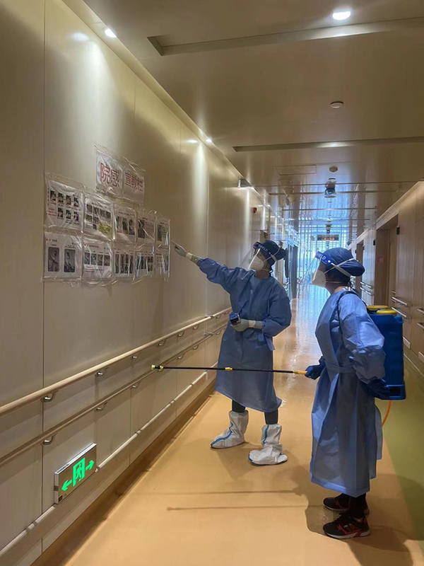 “首先是控制传染源,拒绝密接等异常人员入住。其次要切断传播途径,对入住的工勤人员进行手卫生、消杀、动线规划、个人防护培训及演练。再次要保护易感人群,组织未接种第三针疫苗的72人补种。还要做好对职业暴露、核酸异常、密接管控等应激突发事件的预案。”胡菲说,为了做到零感染,每天早上工勤人员用洗地机做清洁,保证每天2次消杀,同时对物表环境采样近50管;负责消杀的阿姨每天要把32斤的消杀溶剂背在身上4个多小时。截至4月底,共进行9批次、54人次、18小时的院感培训。