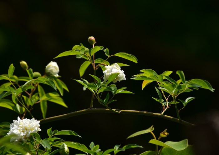 大致勾勒一下荼蘼的样子:植株形态是藤蔓或蔓性灌木,枝条有刺,三枚小叶或羽状复叶,春末夏初开花,花白色,且很香。