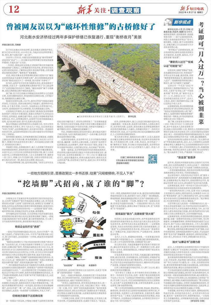一年多后,围绕这座全国重点文物保护单位所开展的维修加固保护工程竣工,古桥重新面向市民开放。新华每日电讯记者日前实地采访,了解到经过两年多的保护修缮,古桥关键部位得到稳妥维护,“衡桥夜月”美景重现。