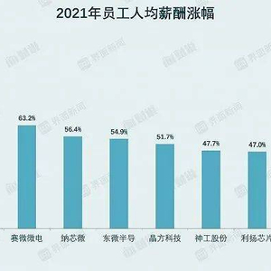A股半导体公司中,人均薪酬涨幅最高的是紫光国微(002049.SZ),高达109%。英集芯(688209.SH)、赛微微电(688325.SH)、纳芯微(688052.SH)、东微半导(688261.SH)等公司人均薪酬去年也有较大涨幅。