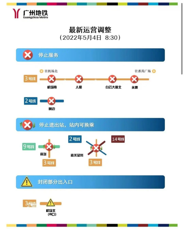 据广州市交通运输局和广州地铁通知,接政府部门通知,因疫情防控需要,从5月4日起,广州市交通部门临时采取以下公共交通管控措施: