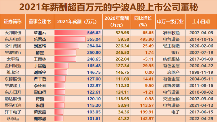 2021年,甬股董秘年薪过百万的有14人,排在前三位的是天邦股份董秘章湘云(546.62万元)、东方电缆董秘乐君杰(355.04万元)、公牛集团董秘刘圣松(284.04万元)。另外还有宁波银行董秘俞罡的薪酬(250.8万元)和太平鸟的董秘王青林(248.65万元)的薪酬超过了200万元。