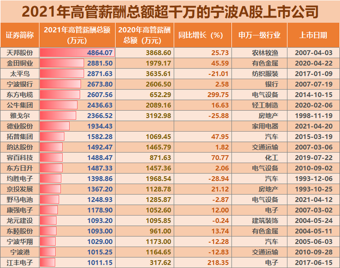 在披露管理层薪酬总额的109家宁波上市公司中,总额最高的是天邦股份,高达4864.07万元。这也是2021年宁波A股中管理层薪酬总额唯一超过3000万元的。(比2020年减少了2家,分别是太平鸟和雅戈尔,它们2020年分别为3635.61万元和3192.98万元。)