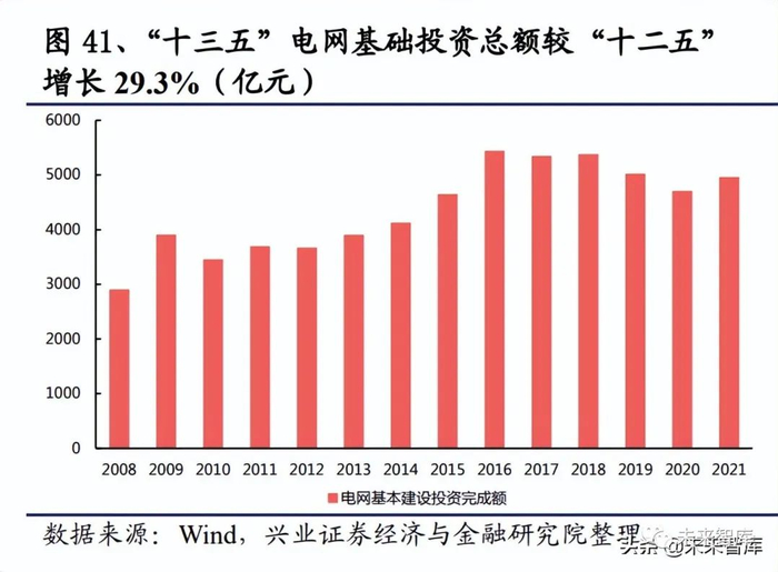 特高压线路于“十三五”时期呈现跨越式增长:特高压电网线路可进行长距离点对点输电,其中长距离输电主要以直流特高压线路为主,“十三五”时期特高压 电网投产节奏提速,2016-2020 年间国网、南网合计投产 18 条特高压线路,多数 输送终点为国内电力负荷中心,带动电网基础投资总额大幅上涨。其中,“十三 五”时期国内电网基础投资总额达到 2.59 万亿元,较“十二五”时期增长 29.3%,期间国家电网特高压线路新增总长度 2.49 万公里,较“十二五”时期新 增总量高出 195.1%。