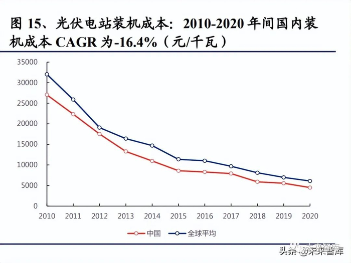 装机成本构成:除光伏组件以外的其他成本为 2000 元/千瓦,组件为可变成 本,光伏组件成本假设中枢约为 2000 元/千瓦(约合 2.0 元/瓦)。(报告来源:未来智库)