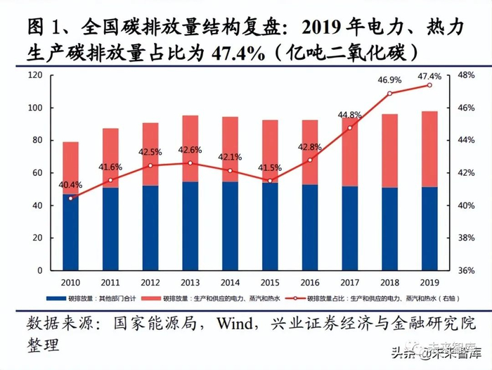 当前,传统火电(包含燃煤、燃气等火力发电方式)仍占 据我国电力结构中的主要部分,其中 2021年火电发电量占当年全社会用电量的 67.9%,同时 2019年电力、热力等生产的碳排放量占全国排放量的 47.4%,因此 电力结构清洁化转型亦可理解为降低化石能源终端消费占比、提升非化石能源消费比重,国务院《关于完整准确全面贯彻新发展理念做好碳达峰碳中和工作的意 见》对我国碳中和实现路径中的关键时间节点及对应非化石能源消费比重进行了 重点指引。在此过程中,新能源装机量提升为非化石能源消费比重增长,乃至我 国能源结构转型的基石。