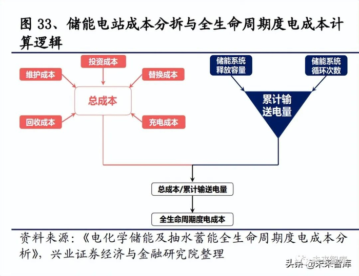 储能配置增大电源侧成本,类别大体包含抽水蓄能、电化学、氢储能等主要方式。以电化学储能为例,其成本大体包含四类:储能系统初始投资成本、维护成 本、充电成本、替换成本。因此,以储能系统全生命运营周期的角度看待储能系 统度电成本,其影响因素大体包含:1)储能系统 EPC 成本、2)充放电次数 (利用率)、3)放电深度(影响最大充电容量)、4)电池替换成本、5)外部购 电成本、6)维护成本。