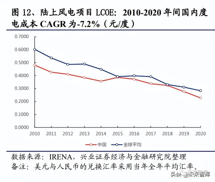 度电成本降低为推动新能源发电渗透率提升的重要因素之一,度电成本的下降 主要由装机成本降低与利用效率提升(也即利用小时数提高摊薄度电成本)两 方面因素带来。陆上风电与光伏发电项目在 2010-2020 年间度电成本均大幅降 低,其中以国内当年新建电站为例,2010 年与 2020 年国内新建陆上风电平准化 度电成本(简称“LCOE”)分别 0.4806、0.2276 元/千瓦时,新建光伏电站 LCOE 分别为 2.0647、0.3035 元/千瓦时,二者同期内 LCOE 分别累计-52.6%、- 85.3%,10 年间度电成本降本 CAGR 分别为-7.2%、-17.4%。