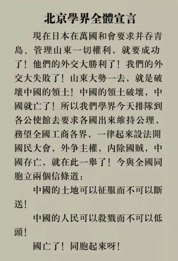 祖国背负的屈辱和苦楚令这名青年“不容推辞”:作为一战胜利者之一的中国,依旧摆脱不了被他国任意摆布的命运,正承受着恶邻日本把山东从肌体上生生剜去的疼痛。更让人愤怒的是,国内还有曹汝霖、陆宗舆、章宗祥等卖国贼对这赤裸裸的侵略的迎合。