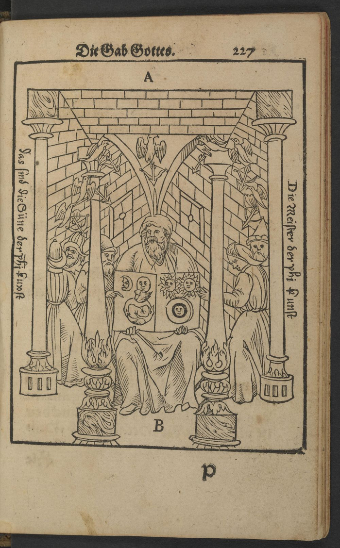 炼金术书籍的作者经常将成功归功于上帝的恩典或启示。在宗教图像学中,这种智慧可能从天而降,被人类抄录成卷。在13世纪《圣经》的一页中,发光的大写字母显示使徒保罗端着卷轴坐着,代表他给哥林多人的书信。
