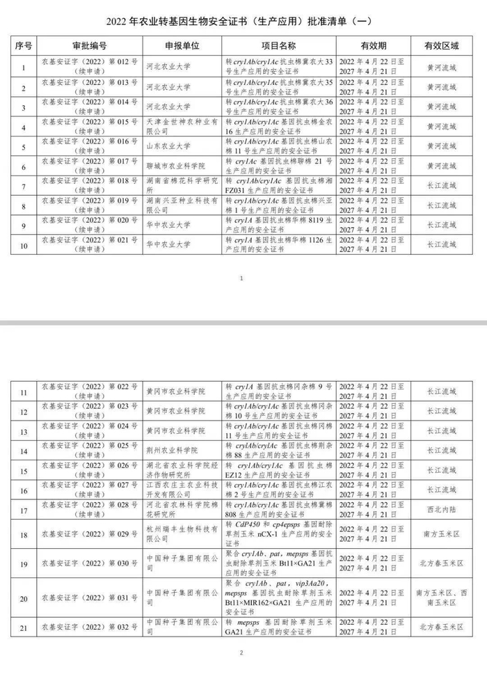 农业农村部发布同日发布的《2022 年农业转基因生物安全证书(进口)批准清单(一)》显示,拜耳作物科学、科迪华、巴斯夫等申报的项目获批。