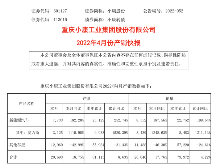 5月4日,小康股份披露公告,4月公司新能源汽车销量8552辆,同比增长187.56%;其中赛力斯销量3439辆,同比增长1248.63%。