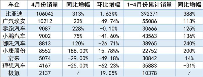 近日,多家新能源汽车企业公布4月产销数据。
