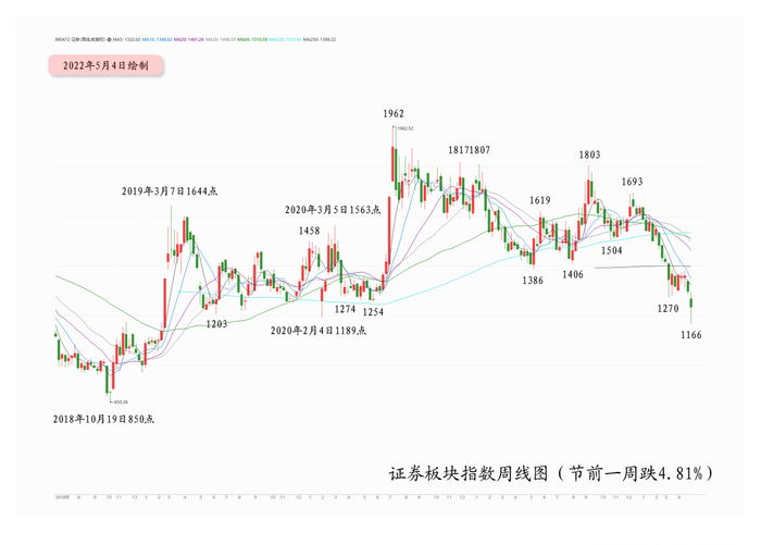 节前一周证券股一举击破了3月9日前低1207点,最大跌幅近10%,周四(4月28日)最低的1166点已击破近三年最低的1189点。这意味着证券股已跌穿相应于上证指数2020年3月2646点价位,对大盘中期而言是趋坏的信号。
