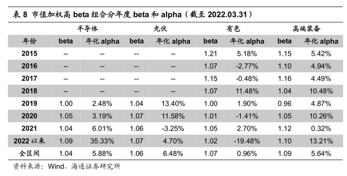 分年度来看(表8),仅有高端装备行业的高beta组合在2019年的beta小于1,其余行业及年份上,组合的beta均≥1。值得注意的是,上述构建高beta组合的方法并未过多考虑alpha表现。而且,较高的beta意味着无论是在市场上行还是下跌阶段,组合都会表现出更大的业绩弹性,因此未必能实现理想的alpha。但我们发现,各行业的高beta组合在大部分年份上均获得了正向alpha。尤其是半导体和高端装备,在回测区间内的每一年,alpha都大于0。相对而言,有色行业的高beta组合不仅alpha的水平较低,波动也较大。