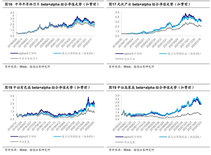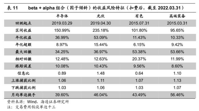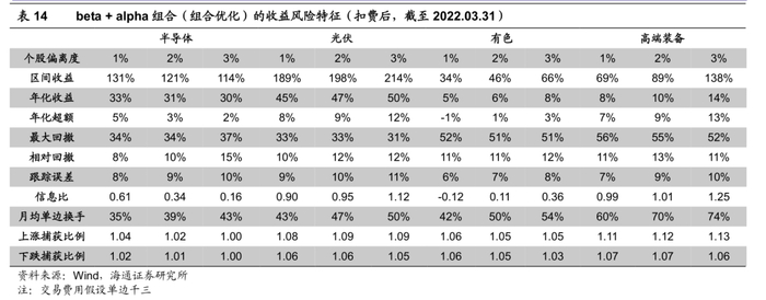 进一步扣除单边3‰的费用后,我们得到了组合优化方式下,beta+alpha组合的收益风险特征及弹性指标。除半导体行业外,光伏、有色、高端装备行业的优化组合上涨捕获比例都大于1.05,但也承担了较高的下行风险。有色行业的年化超额收益最低,最大值仅为3%;高端装备的年化超额收益表现相对较好,最高可达14%。