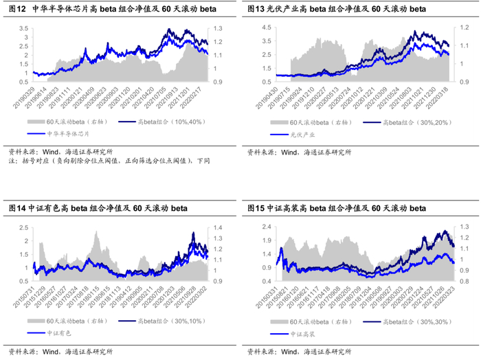 图8-9展示了不同筛选阈值组合下,月均高beta个股数量和个股平均beta。筛选时,因子均按照升序排列。横向来看,高beta个股数量越少,个股平均beta越高。纵向来看,有色和高端装备行业在不同阈值组合下的个股平均beta更高,在1.0-1.1之间波动。