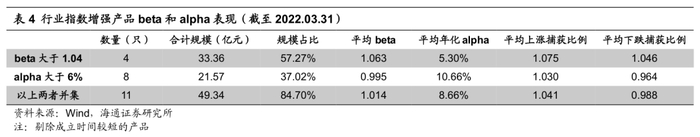 由上表可见,具备beta或alpha优势的产品数量占比68.75%,规模占比84.70%。我们推测,对于行业指数增强产品,只要具备beta和alpha中的一种优势,就有可能受到投资者的关注。既然如此,我们不妨“得寸进尺”,看看能否将beta和alpha这两个优势进一步结合,力争在日趋激烈的竞争中脱颖而出。