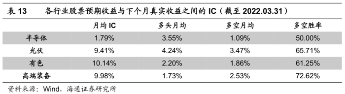 我们认为,可能的原因是,1)对于半导体和光伏行业,组合beta的提升难度相对更高。因此,第一步优选高beta个股时,就需适度放宽跟踪误差,从而影响第二步的alpha提升效果。2)我们建立的是全市场股票的多因子模型,即所有行业采用相同的因子,预测效果在不同行业之间可能存在较大分化。以半导体行业为例,通过这种方式获得的股票预期收益与下个月真实收益的月均IC不到2%,而另外三个行业都在10%附近。