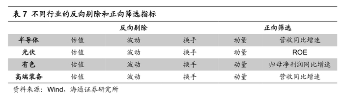 结合上述发现,我们认为,针对这4个行业,可以尝试如下方法筛选高beta个股。首先,反向剔除一部分低估值、低波动和低换手的股票。随后,等权加总动量和成长/盈利因子,正向筛选一部分得分较高的股票。每一个行业用到的因子如下表所示。