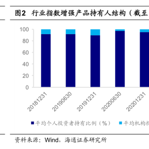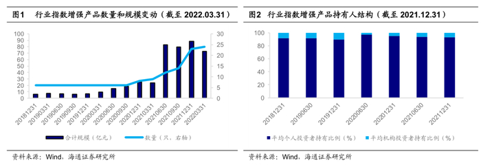 自2018年底以来,A股行业分化显著,行业指数增强产品以此为契机迎来快速发展,数量突破20只,年化复合规模增速高达113.09%。从持有人结构来看,个人投资者的平均占比在90%-95%之间波动。截至2022.03.31,全市场共有171只指数增强股票型基金,合计规模1494.70亿元。其中,行业指数增强基金24只,占比14.04%;合计规模72.50亿元,占比4.85%。