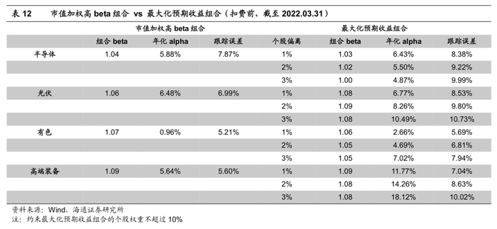 第二步:优化个股权重,提升组合alpha。我们测试了两种方法,以继续提升组合的alpha表现,其一是基于alpha因子得分的权重倾斜,其二是组合优化。在相似的跟踪误差下,除高端装备板块上,两者不相伯仲外,半导体、光伏和有色行业的因子倾斜组合都优于组合优化方法,具体表现为更高的beta、年化alpha和超额收益。当然,如果对跟踪误差有更为明确的控制要求,组合优化也不失为一种选择。