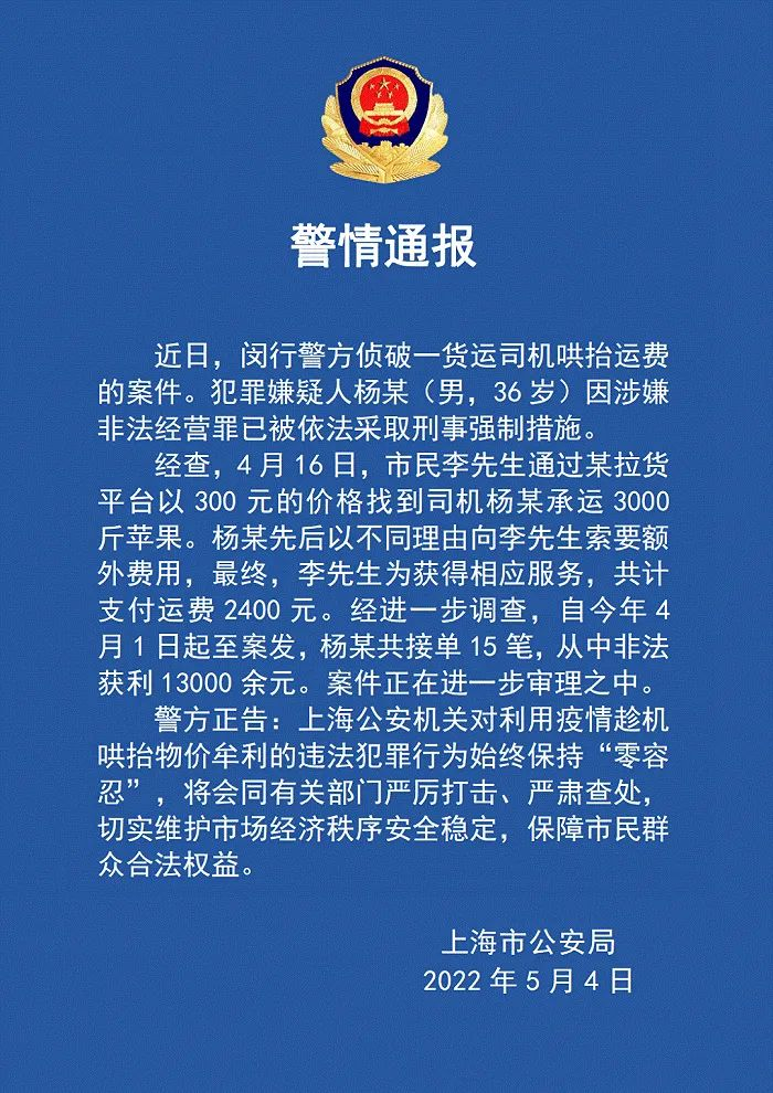 4.上海一货运司机哄抬运费被采取刑事强制措施