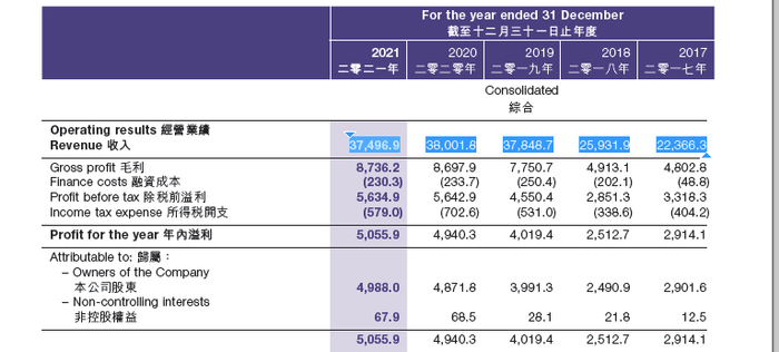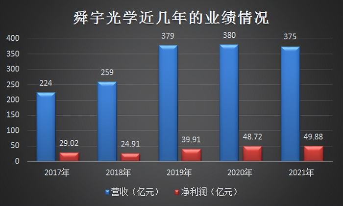 根据舜宇光学科技发布的年度业绩报告显示,2021年,舜宇光学科技实现收入374.97亿元,同比下降了1.3%;实现归属上市公司股东的净利润49.9亿元,同比增长2.4%。