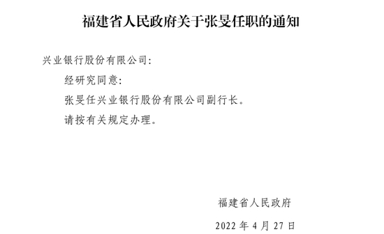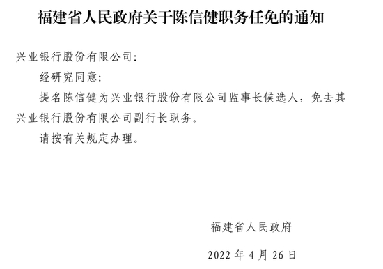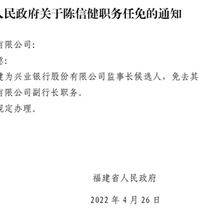 4月26日、27日,福建省政府连发两项人事任命公告——提名陈信健为兴业银行监事长候选人以及原杭州分行行长张旻任兴业银行副行长。