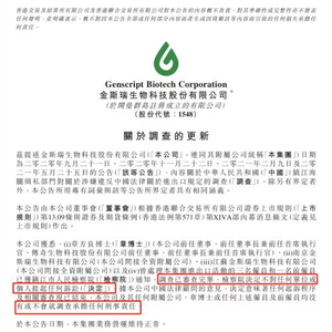 公告称,金斯瑞前任董事、前任董事长兼前任首席执行官、传奇生物科技股份有限公司前任董事、前任董事长兼前任首席执行官章方良博士,南京金斯瑞生物科技有限公司以及曾处理本集团进出口活动的三名雇员和一名前雇员,已获镇江市人民检察院通知,调查已审查完毕,检察院决定不对任何单位或个人提其任何诉讼。
