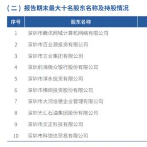除腾讯以30%的持股比例占据第一大股东的宝座外,还包括深圳百业源投资有限公司(简称“百业源”)以及深圳市立业集团投资有限公司(简称“立业集团”),分别位列第二、三大股东,持股比例均为20%,同时这三家公司也是微众银行的发起人。