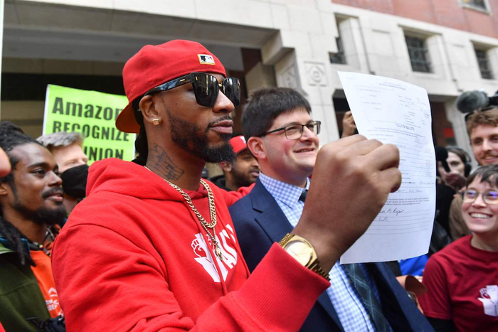 当地时间2022年4月1日,美国纽约,亚马逊工会创始人Christian Smalls拿着投票结果单。当日,美国纽约斯塔滕岛(Staten Island)的亚马逊员工投票决定是否成立亚马逊工会。如果工会最终成立,标志着亚马逊将成为历史上第一个成功成立工会的美国公司。