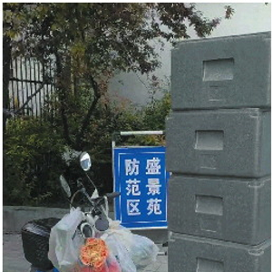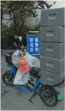 孔祥吉驾驶的那辆配送电动车上,最醒目的就是后座上那五个配送箱。他一米七左右的个头,把配送箱摞好放在车上,还得踮起脚才能绑上绳子把配送箱固定住。此外,电动车的车把上、踏板处也都放上了物资。