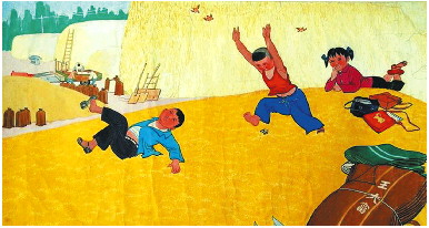农民的思想感情与审美使农民画作品体现出一种特殊的感情色彩,带有浓郁的生活气息与乡土味。宋全国的《晒粮》表现的是丰收场上农民翻晒五谷杂粮的场面,整个画面构图饱满,地面涂以黑色,粮食为红色和黄色,以此表现粮食金子般的珍贵。傅成峰的《大篷歌》,则画了众渔民推动绞车升起大篷的场面。酱红色的大篷占了半个画面,周围是蔚蓝的大海与如花的海浪、众多飞翔的白色海鸥,中间是推动绞车的渔民。显示出渔民们兴高采烈地升起大篷,即将出海捕鱼的热闹场面。他们的作品总是画得很满。问其原因,他们说,“我们画画和种地一样,不愿意浪费每一寸土地。”他们就这样,心里怎么想就怎么画,不受任何约束,堪称农民自己心中的艺术。